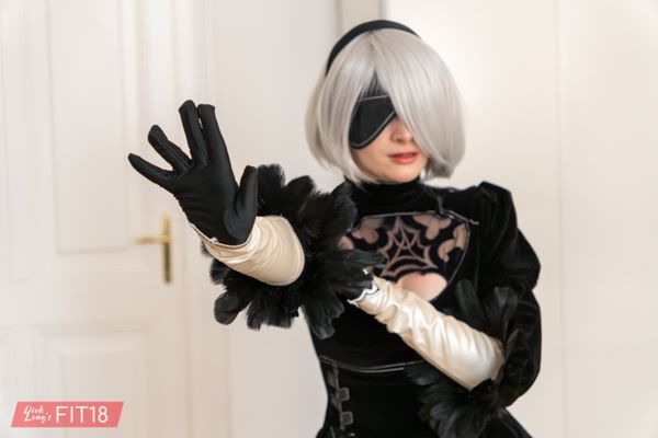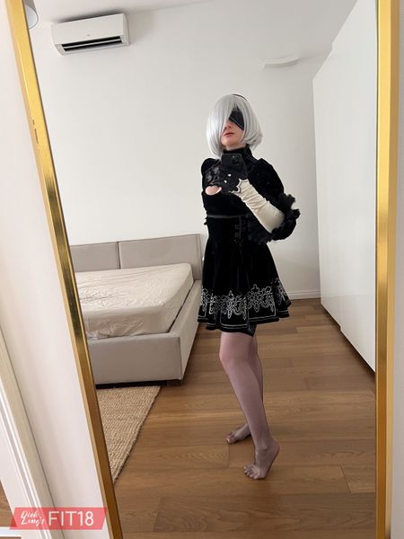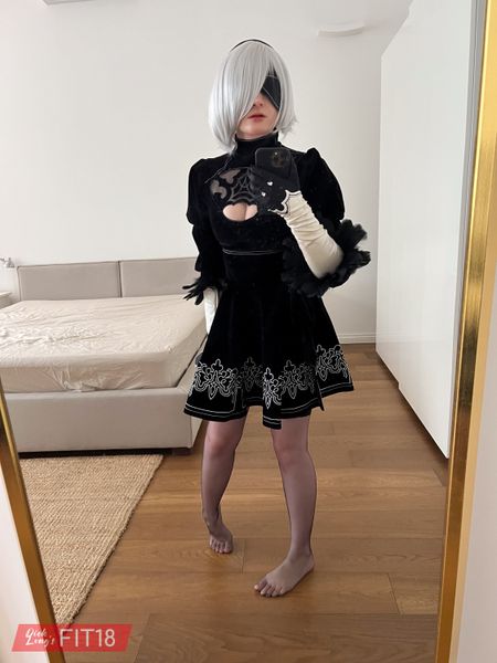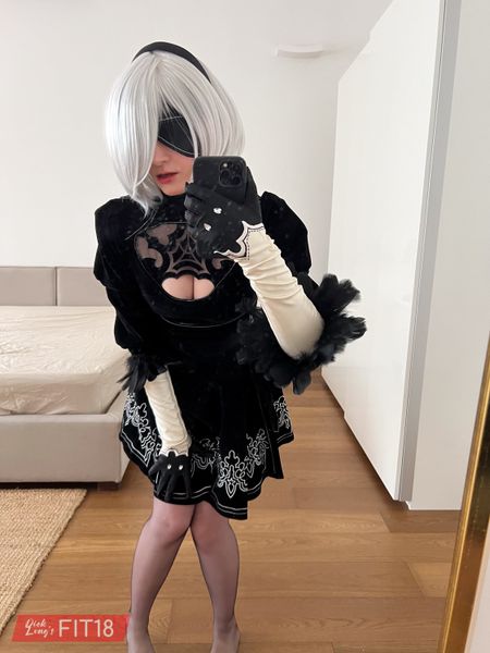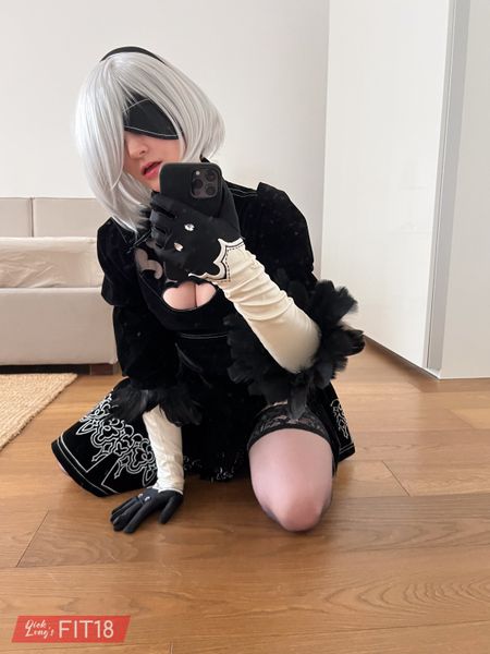 Amber KawaiiA special scene for Halloween: the lovely Amber Kawaii returns, and because it is Halloween, she suggests a little role-playing. Giving her a brief moment to change, the normally blonde, blue-eyed Amber appears in a black dress, stockings, short silver wig, and eye-patch, to look like Android 2B from the popular action game: Nier Automata.